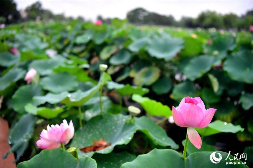 广昌县莲花科技博览馆内盛开的莲花,雷雨过后沾着雨水的花瓣更显娇艳欲滴、润泽动人。人民网记者 时雨摄人民网广昌7月16日电 (记者时雨)一场雷雨过后,江西省广昌县莲花科技博览馆内盛开的莲花和睡莲显得娇艳欲滴、润泽动人,科研人员在莲池内忙着管护,而游客则悠闲漫步在花海中赏花打卡。