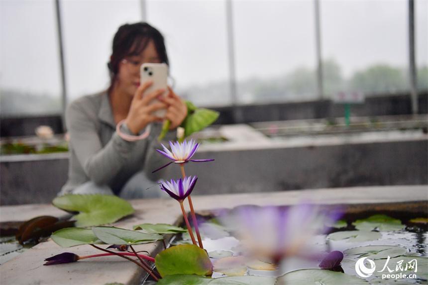 广昌县莲花科技博览馆内盛开的睡莲吸引游客拍照打卡。人民网记者 时雨摄